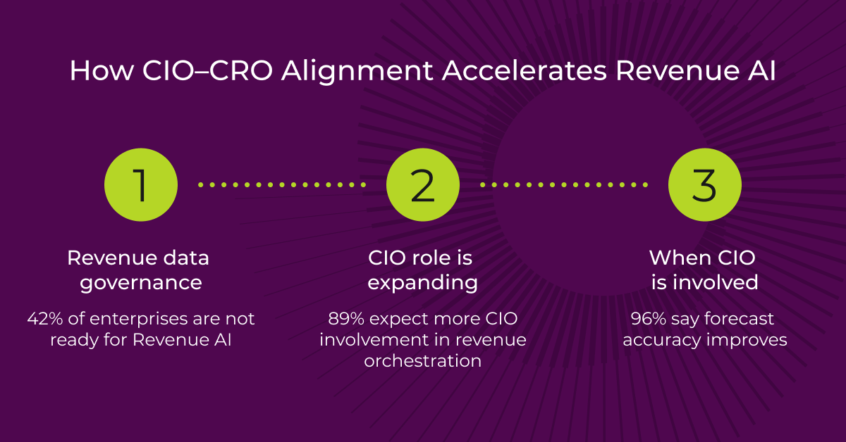 98% of enterprise leaders say CIO–CRO collaboration directly impacts revenue performanceYet 28% meet only monthly or quarterly, far too infrequently for real-time AI-driven revenue management96% agree that forecast accuracy improves when CIOs are directly involved89% expect the CIO's role in forecasting to increase over the next year
